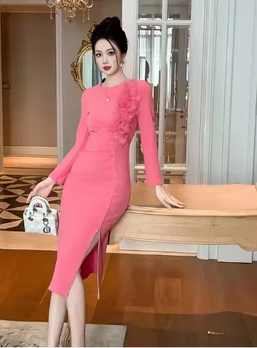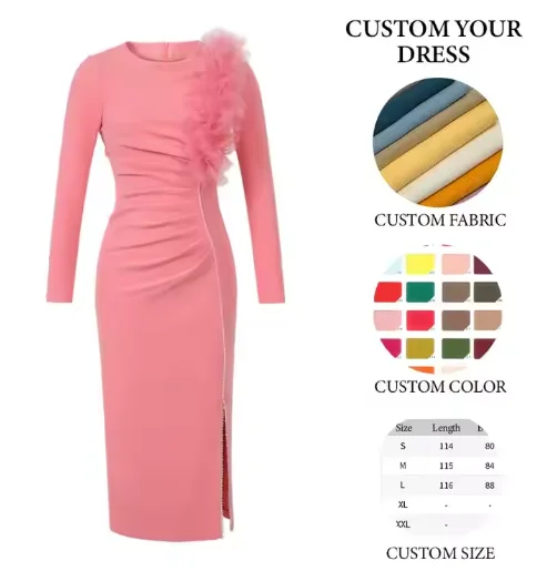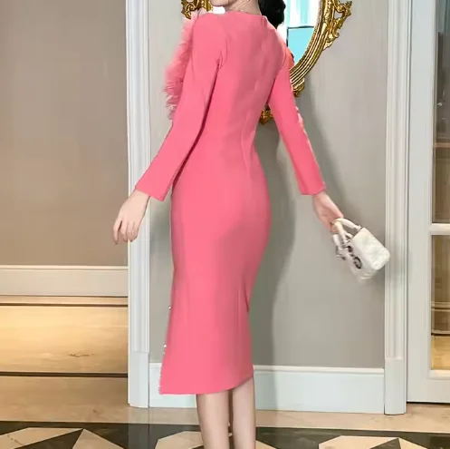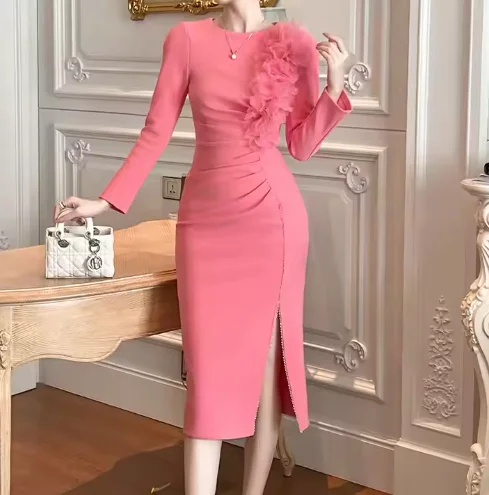 Autumn Winter New Arrivals High-End Custom Floral Ruffled Bodycon Dress Vintage Style Midi Hip Accent Crystal Breathable Natural